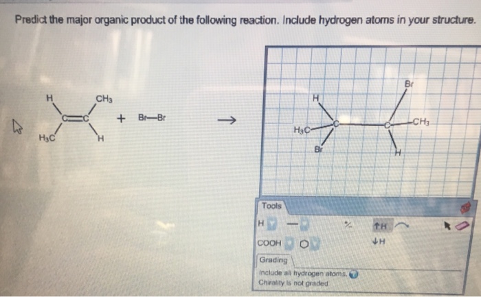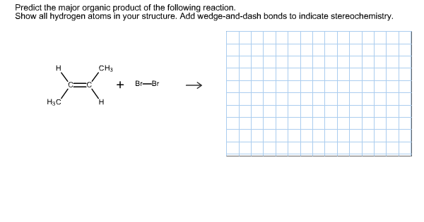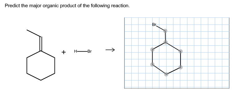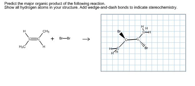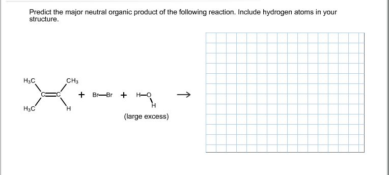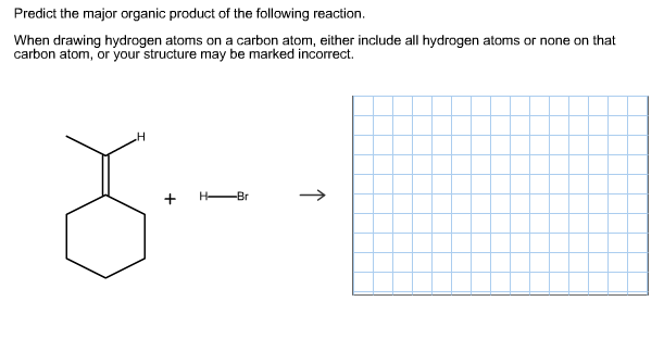 When drawing hydrogen atoms on a carbon atom, either include all hydrogen atoms or none on that carbon atom, or your structure may be marked incorrect draw the structure of the alkene that reacts with hbr to give the following alkyl bromide as the major organic product predict the product for the following. Predict the major product(s) of the following reaction, giving regiochemical and/or stereochemical details as relevant. When drawing hydrogen atoms on a carbon atom, either include all hydrogen atoms or none on that carbon atom, or your structure may be.